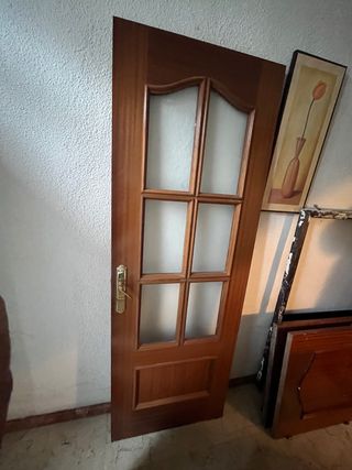 Puertas de madera para interior, con diseño clásico y elegante. Algún marco o tapeta están algo deteriorados. -Baño 62,5 cm: 45€, abre a izquierda -Salón cristal 82,5 cm: 60€ abre a dcha. - Marco de madera de roble. - Paneles de cristal esmerilado. - Tirador dorado. Altura 203 cm