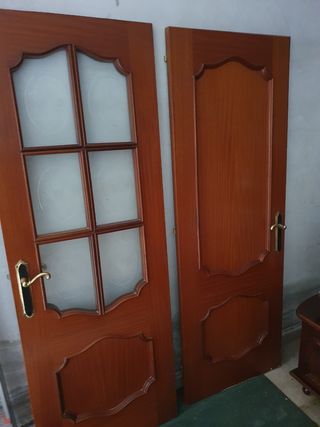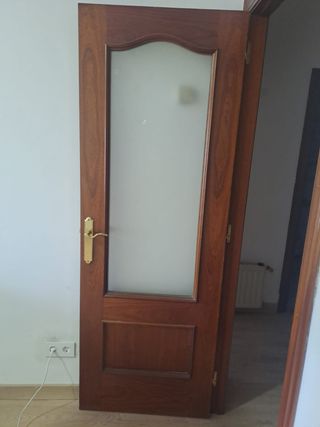 Se venden puertas de madera maciza. 2 puertas de baño. 1 de cocina con cristal. 3 deHabitaciones y 1 doble de salón con cristal. Incluyen las jambas y las manillas y bisagras. Buen estado . Se cambian por cambio de decoración. 5 abren a las derecha y una a la izquierda y la doble del salón a la derecha.