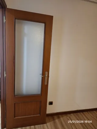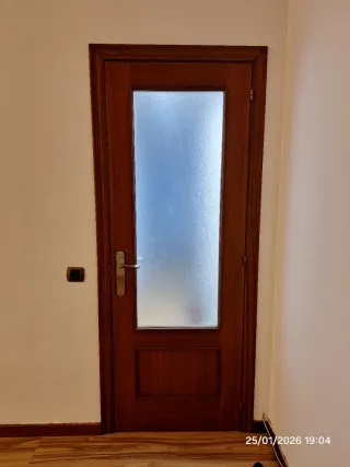 Puertas de madera: 2 con un panel de cristal translúcido en la parte superior y un panel de madera en la inferior. 149€ las 2. 5 ciegas. 2 de ellas con posibilidad de poner respiradero (para el baño). Una de las puertas tiene la manilla dañada estéticamente. 149€ las 5. - Marco de madera. - Tirador metálico color plateado.
