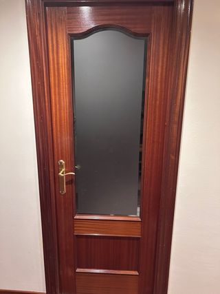 Elegante puerta de madera con detalles de cristal esmerilado. - Diseño clásico con paneles. - Cristal con motivos decorativos. - Acabado en madera oscura. No me hago cargo de desmontarla. Se pueden llevar los marcos de la puerta