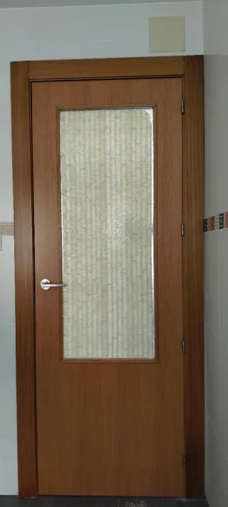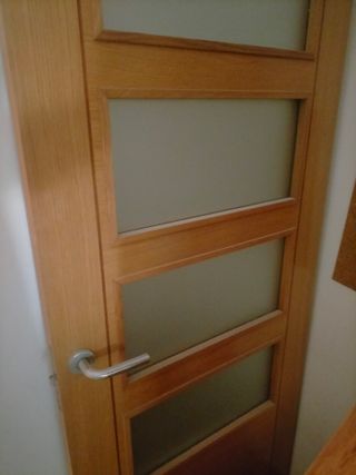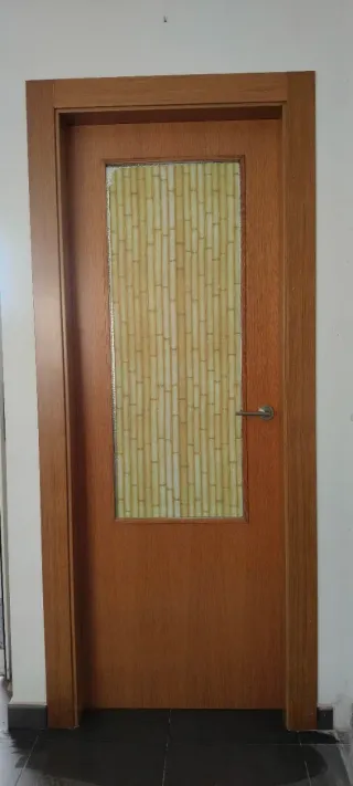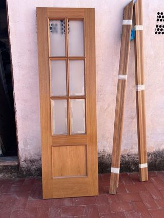 Puerta de madera con un panel de cristal. Medidas 203 alto, 73 ancho, 4 grosor - Marco de madera. - Panel de cristal translúcido.