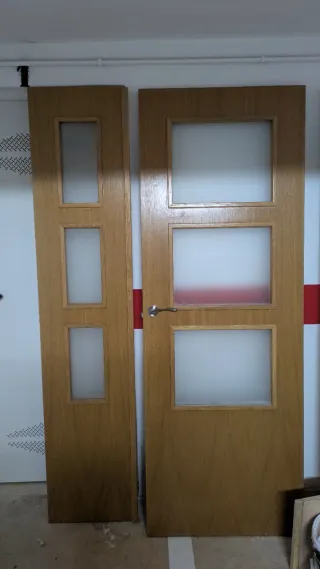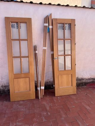 Conjunto de puertas de madera con detalles de cristal. Con marcos tapajuntas y mecanismos - Diseño moderno y elegante. - Materiales de calidad. Para desmontar en Agosto 2026