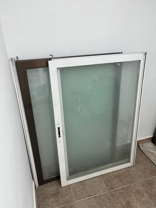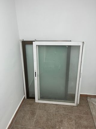 Dos ventanas correderas de aluminio, una blanca y otra marrón oscuro. Ideales para sustituir ventanas viejas o para un proyecto de bricolaje. - Medidas aproximadas: 160cm x 120cm. - Marco de aluminio. - Cristal translúcido. - Incluye cuatro hojas correderas.