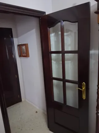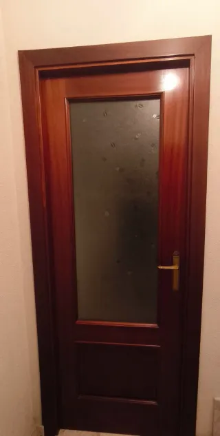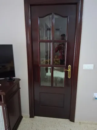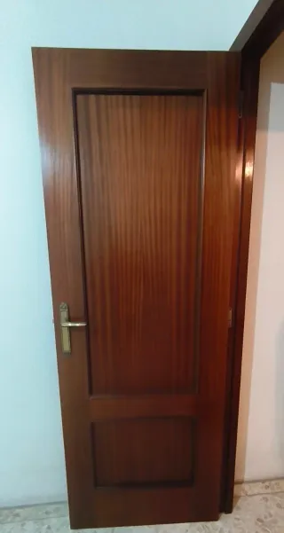 Puerta de madera maciza para interior. Diseño clásico con paneles. - Acabado en tono madera oscura. - Incluye manilla metálica. - Disponibles 4 puertas en liso y 4 con cristal. -Precio por unidad,negociables.
