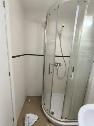 Cabina de ducha con diseño curvo y puertas correderas. - Perfiles de aluminio. - Paneles de cristal. - Tiradores metálicos.