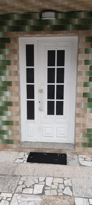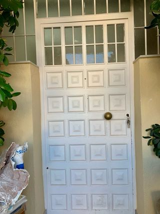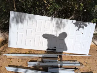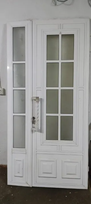 Puerta de entrada exterior de aluminio color blanco. - Paneles de cristal. - Tirador metálico. No tiene marco,ya que se rompió para poder sacar la puerta. Medidas:2,15m. Alto/1,07m.Ancho