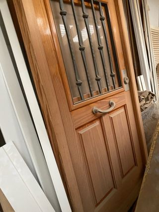 Preciosa puerta de entrada de madera maciza de roble para exterior. Es robusta y de estilo rústico. Peso: 59 kg - Fabricada en madera de altísima calidad. - Incluye cerradura y herrajes de hierro. - Diseño con paneles verticales y detalles decorativos. Medidas: 91cm de ancho 2.07cm de alto Reducible a 86 de ancho y 2,01 alto y ampliable a +10cm por lado con un premarco. En conclusion: Se puede adaptar a espacios de entre 86cm a 101cm de ancho x 2,01cm a 2,17cm de alto. Envios a toda españa Envío GRATUÍTO a contrarembolso a partir de 100km de distancia (por fuera de la app por el tamaño y peso)