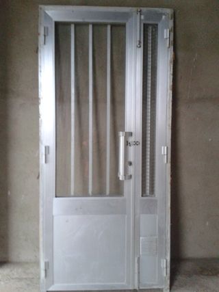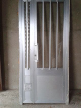 Puerta de entrada de Aluminio ideal para exteriores o interiores. Medidas :de alto 2 m y de ancho 92 - Material: Aluminio - Color: Plateado - Diseño con barrotes y panel inferior - Incluye manilla y cerradura,buen estado, telefono contacto 608613566