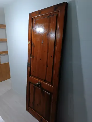 Puerta de entrada antigua, fabricada en madera maciza. Su diseño clásico aporta un toque rústico y elegante. - Material: Madera maciza. - Acabado: Barnizado brillante. - Herrajes: Incluye pomo y cerradura. - Medidas: 2metros x 77,3cm