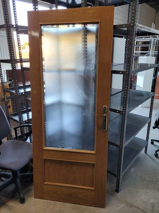 Puerta de entrada de madera con diseño de cristal. 80.5x200x3.5 Como nueva ya se ve precintada Urge precio negociable y más si vienes hoy - Marco de madera. - Paneles de cristal. - Diseño de arco superior.