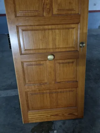 Puerta de entrada de seguridad con acabado en madera. - Diseño con veta de madera. - Dos pomos plateados. Medidas 2,05m altura 0,90m anchura 4 puntos de anclaje.