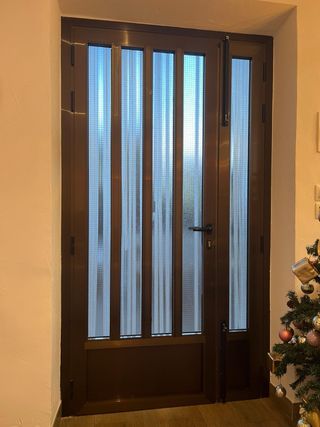 Puerta de entrada de color marrón oscuro, con paneles de cristal estriado que permiten el paso de luz. - Marco de metal. - Diseño con varios paneles verticales de cristal. - Panel inferior sólido. -Medidas 123cm ancho 230 de alto