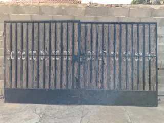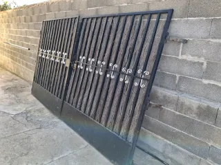 Puerta de entrada fabricada en hierro. Su diseño robusto y clásico la hace ideal para delimitar espacios exteriores. Cambiar cerradura y con enderezar barra lateral de una hoja, saneamiento y pintura hay puerta para siempre. Carpintería Medidas: 185 de alto por 302 de ancho. - Material: Hierro macizo. - Acabado: Negro. Entrega a finales de enero.