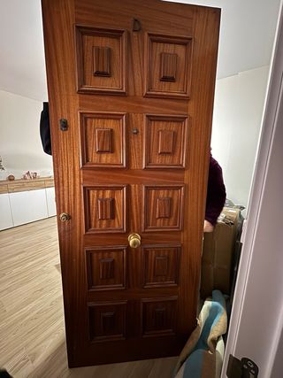 Puerta de entrada de madera de color marrón con diseño de paneles. Tres cerraduras de seguridad. 2,10 cm de alto por 0,90 cm de ancho. - Diseño de 12 paneles. - Cerradura y pomo dorados. - Bisagras metálicas.