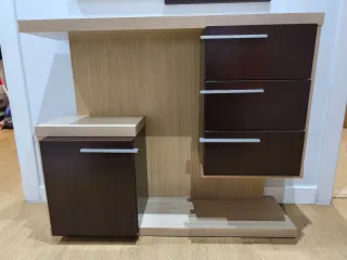 Elegante espejo con un diseño moderno y marco combinado, con marco exterior de madera (roble claro y wengué) Con posibilidad de adquirir también a juego mueble de entrada en excelente estado de conservación, sin arañazos ni desperfectos. Fabricado en madera de dos tonos (roble claro y wengué), de línea moderna y elegante. Con varios compartimentos (1 puerta lateral y 3 cajones con tiradores metálicos) y una encimera superior para dejar llaves, correo o decoración. Precio mueble: 59€. Precio espejo: 18€ Precio conjunto (mueble + espejo): 70€. Medidas mueble: 90 cm (ancho) x 75 cm (alto) x 27 cm (fondo). Medidas Espejo: 80 x 120 cm