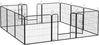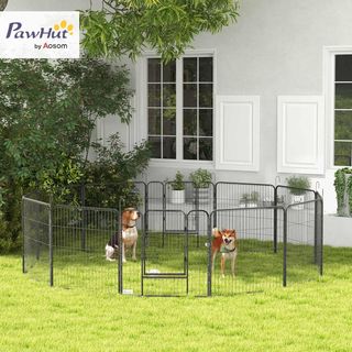 Recinto para perros a 12 paneles modulares, dimensiones del panel: 80L x 80P x 1.5S cm, ideal para perros de pequeña talla hasta 50 cm de altura. Fabricado en acero robusto, garantiza longevidad y estabilidad gracias a las 12 estacas para el suelo incluidas. La puerta de acceso (38P x 53A cm) permite una fácil entrada y salida, mientras que el sistema de cierre asegura la seguridad de tu mascota. Fácil de almacenar, se pliega de manera compacta. Montaje requerido. Color: Gris. Dimensiones totales: 160L x 160P x 100A cm. Perfecto para interiores y exteriores.