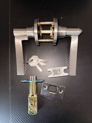 NUEVO SIN USO: Juego de cerradura de puerta de acero inoxidable con acabado plateado. Incluye todos los componentes necesarios para su instalación. -Picaporte de entrada de 60/70mm - Manillas de palanca. - Pestillo. - Placa de montaje. - Tornillos. - Tres llaves.