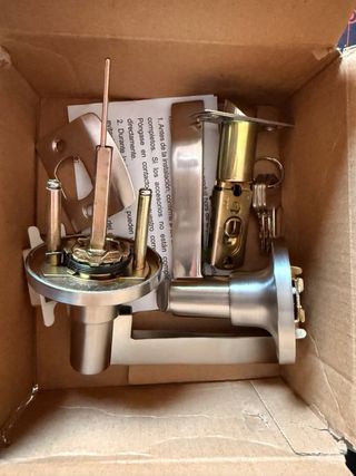 Cerradura de entrada con llave de la marca TESA ASSA ABLOY. - Acabado en latón pulido. - Nuevo a estrenar, estuchado con tornillería - Pomo de entrada, cerradura, llaves originales. - Pomo de paso con pestillo. - Para puertas de grosor entre 33 y 52 mm. - Certificación ISO 9001/ISO 14001. - Fabricado en España.