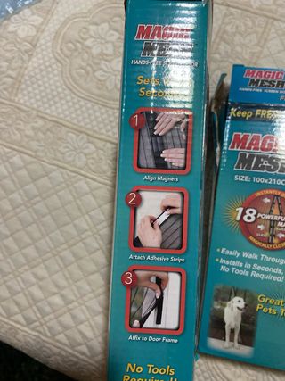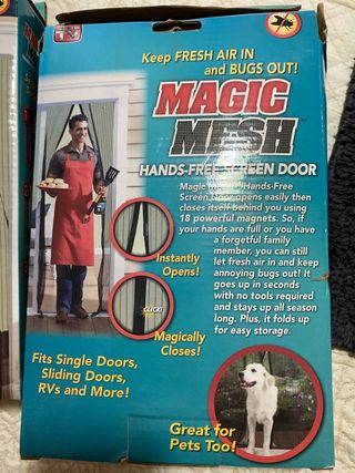 2 Mallas mosquiteras Magica Mesh para puertas. Ideal para mantener fuera insectos y permitir la entrada de aire fresco. - Se instala fácilmente sin herramientas. - Cierre automático con imanes. - Perfecta para puertas sencillas, corredizas, RVs, etc. - Se pliega para un almacenamiento sencillo. - Incluye una mosquitera. En buenas condiciones.m, sin usar Las dos por 15€. una esta fuera de su bolsa, pero no se ha puesto nunca.
