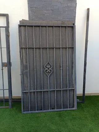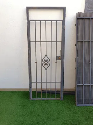 Preciosa cancela de hierro forjado, compuesta por dos hojas. Ideal para entrada de garaje o jardín. - Estructura robusta y resistente. - Diseño elegante con detalles decorativos. - Color negro mate. - En buen estado de conservación. Hay que cambiar el bombín porque no tiene llave y soldar una pletina a los perfiles donde engancha Medias una hoja de 1'0 3 cm y de ancho 1,6 cm y de alto 1,78espesor 5 cm
