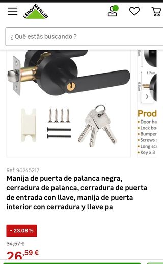 Manija de puerta de palanca negra, en perfecto estado. - Incluye cerradura de palanca. - Cerradura de puerta de entrada con llave. - Manija de puerta interior con cerradura y 3 llaves. - Incluye tornillos y tope de puerta.