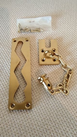 Set de tres cadenas de seguridad para puertas, fabricadas en latón. - Material: Latón. - Incluye tornillos para su instalación. Nuevos. Sin estrenar. Precio unidad: 7€ Precio 3 unidades: 15€ Se entrega en Madrid (Atocha). También envíos.