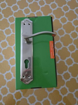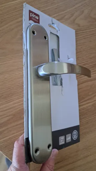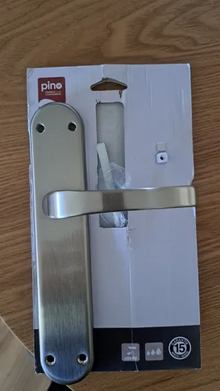 Manilla de puerta de la marca Pino, con acabado en metal cepillado. - Diseño de apertura para mano derecha. - Incluye placa de manilla. - Ideal para interiores. Se instaló el otro para una puerta de entrada.