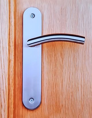 Manillas de acero inocidable para puertas de interior, hay 3 juegos completos en perfecto estado y 1 suelta nueva a estrenar en su embalaje, ya que es para la puerta de entrada troquelando el bombín (como se ve en la foto la mía). Medidas: Alto: 24,5 cm. Ancho: 4,5 cm.