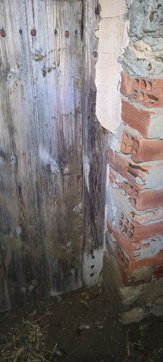 Puerta de entrada de madera con remaches metálicos. - Diseño rústico y antiguo. - Construcción robusta en madera. - Detalles de remaches decorativos.