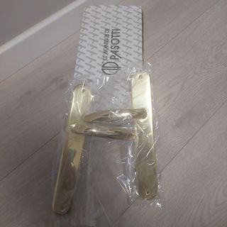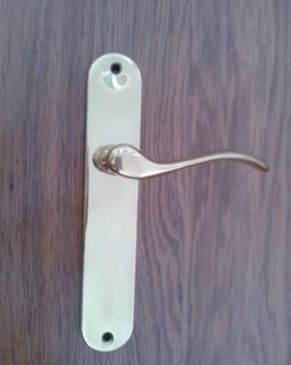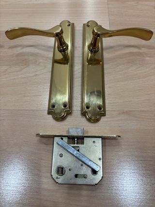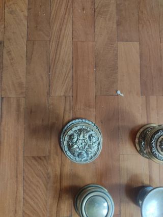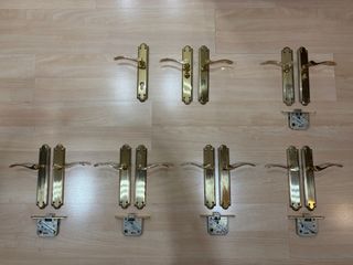 Juego de manivelas de latón o similar para 7 puertas, con sus resbalones y tornillos. También la interior de la puerta de entrada, con troquel para cerradura. Recogida en domicilio.