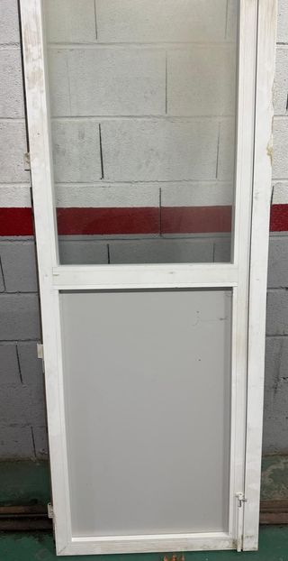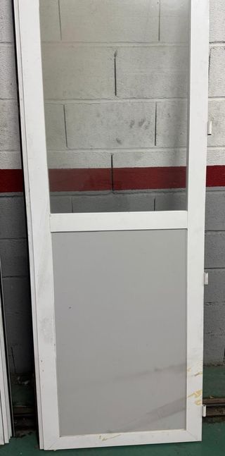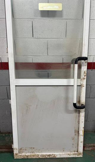 Dos puertas acristaladas de aluminio lacado en blanco. Procedentes del cierre de una tienda. - Medidas: 2,045 m x 0,72 m - Material: Aluminio lacado. - Color: Blanco. - Precio por las dos puertas. - Se pueden vender por separado (90€ cada puerta). - Están sucias pero en buen estado. puerta, aluminio, lacado, blanca, acristalada, cristal, tienda, entrada, salida, zaragoza