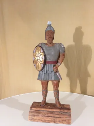 Figura decorativa de un guerrero con diseño de soldado, ideal como tope de puerta. Añade un toque único a tu hogar. - Base de madera rústica. - Escudo detallado. - Espada y casco.