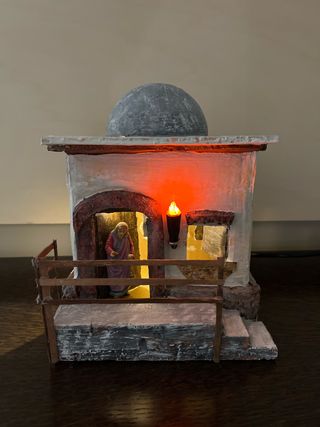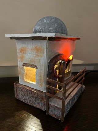Casa hebrea para belén, ideal para figuras de 8cm. La figura es para indicar la escala y no esta incluida. - Diseño detallado. Ventanas, puerta y escalera - Aspecto rústico. - con iluminacion simulando antorcha exterior mas led interior
