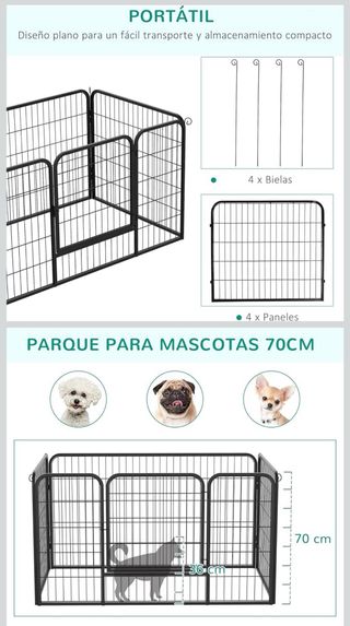 Parque para perros de fácil montaje y desmontaje. Ideal para mantener a tu mascota segura en interiores o exteriores. - Medidas: 125 cm (largo) x 80 cm (ancho) x 70 cm (alto). - Puerta con pestillo de seguridad. - Apto para perros de hasta 10 kg y altura de hombros < 36 cm.