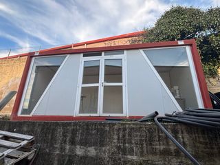 Caseta de obra modular con estructura metálica y paneles de aislamiento. - Amplias ventanas de cristal. - Puerta de acceso doble. - Color rojo en el marco exterior.