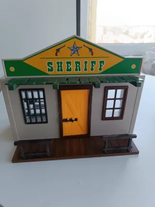 Edificio de Playmobil con temática de Sheriff. - Techo verde. - Puerta amarilla. - Ventanas con rejas y marco marrón. - Dos bancos exteriores.
