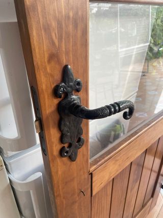 Puerta de madera con un diseño rústico y una manilla de hierro forjado. - Material: Madera. - Acabado: Natural. - Estilo: Rústico.