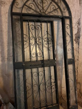 Elegante puerta de hierro forjado con detalles decorativos y paneles de cristal. - Diseño con rejas de seguridad. - Marco de hierro resistente. - Cristales translúcidos.