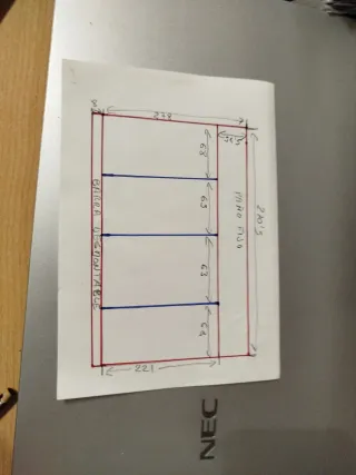 Puerta de garaje con medidas detalladas en el plano.Echa de chapa tipo Pegaso similar a la de la foto - Ancho total: 278 cm. - Alto total luz entrada: 221 cm. - Divisiones internas: 2 secciones de 63 cm y 2 de 68 cm. Puertas abatibles - Grosor de las divisiones: 36.5 cm.