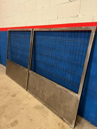 Se venden puertas de garaje con reja superior. Ideales para entrada de vehículos o como divisiones. • Panel inferior liso. • Parte superior con reja. • Acabado en metal. • Colores a su gusto • Entrega inmediata • Consultar nuestros precios y condiciones • Entrega en su localidad Trabajamos con cualquier tipo de puerta, en madera o cristalera, puertas correderas o abatibles y también con otras cosas de la carpintería metálica, como rejas de seguridad, barandilla, tejado/porche y otros como estanterías, escaleras y etc. Contáctanos en +34 604 21 31 70