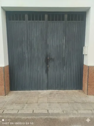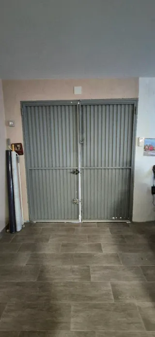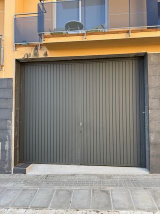Puerta de garaje metálica de color gris. Se compone de dos hojas. - Material: Metal. - Color: Gris. Medidas 180 cm ancho x 250 cm altura total. Puertas 85 cm ancho x 206 cm altura. Tiene un pico de cristal roto, se ve en la 3 foto.