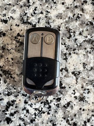 Mando a distancia para puerta de garaje con dos botones. - Botones marcados con A y B. - Incluye anilla para llavero. - con pilas incluidas