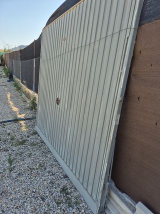 Puerta de garaje metálica de segunda mano. Ideal para sustituir una puerta vieja o para un proyecto de bricolaje. - Fabricada en metal. - Color gris verdoso. - Presenta señales de uso. Tiene fijo arriba de21cm se vende aparte.