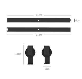Kit de hardware para puerta de granero deslizante de 243.8 cm, kit de pista de alta resistencia de 149.7 kg para dos puertas, se ajusta a un ancho total de 112-131 cm y paneles de 3.3-4.6 cm de grosor. Presenta una construcción de acero al carbono duradera y resistente a la corrosión con una capacidad de peso de 330 lbs. Instalación sin esfuerzo con ajuste flexible y poleas deslizantes silenciosas y suaves que protegen su riel. Número de modelo del artículo: 010-3.0m. Se ajusta a un ancho de puerta: 3.7-4.3 pies (1.12-1.32 m) para 2 puertas. Dimensiones del producto: 96.1'' x 1.5'' x 0.2'' (2440 x 39.24 x 5.6 mm), peso neto: 17.9 lbs (8.1 kg), y se ajusta a un grosor de puerta: 1.3 - 1.8 in (32 - 45 mm).
