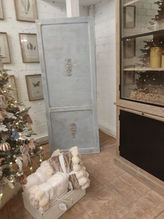 Preciosa puerta recién restaurada estilo sabby chic romántico francés en tonos oro blanco y azul cielo, envejecido efecto ahumado con cera oscura. Todas nuestras piezas cuentan con tratamiento preventivo anticarcoma y son restauradas con productos con base agua respetuosos con el medio ambiente. Cuentan con imperfecciones propias del paso del tiempo, lo que les hace especiales. Ideal como cabecero, puerta de granero, decoración escaparates, tiendas, eventos, etc. Decoración única y exclusiva, ninguna pieza igual. Actualización cómoda, mesitas, dormitorio, mesa, sillas, armario, aparador, vitrina, mueble, estantería,