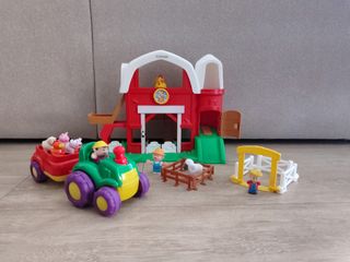 Granja + tractos con sonido En la granja Hay puertas para abrir y cerrar, que activan canciones y divertidos sonidos de animales; un granero para lanzar objetos en su interior y un tobogán con animados sonidos; una embaladora que se inclina hacia arriba para cargar la paja hasta el piso superior del establo; una gallina que cacarea en su nido, y unas vallas para construir un corral separado de la granja. Las puertas de la granja, como siempre, se abren con un mugido o un relincho y canciones que estimulan la imaginación de los niños sobre la vida en la granja.