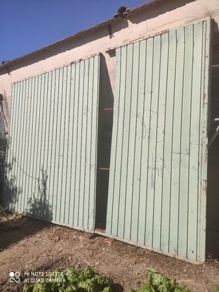Se vende puerta de hierro. Medidas 4 metros de ancho. 4'08 metros de altura. No tiene contrapesos, pero si que tiene las guías para contrapeso. Tiene marco la parte de arriba, la parte de abajo los tiene cortado a la altura de la mitad. La hoja grande también está cortada como se ve en la foto, tengo las laminas del corte.