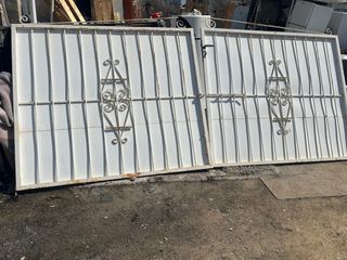 Puerta de garaje de hierro con medidas de 4 metros de ancho por 2.7 metros de alto. Puerta de dos hojas abatible, cada hoja de 2m de ancho. - Material: Hierro. - Color: Beige.