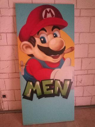 Puerta de interior decorada con un diseño de Mario Bros. Ideal para un baño. - Diseño único y llamativo. - Perfecta para darle un toque divertido a tu hogar. - Se encuentra en buen estado.Medidas 92 x 201(