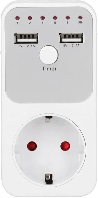 Toma enchufe con temporizador cuenta atrás con 2 puertos USB Nuevo en caja - Indicadores LED para horas (1, 2, 4, 6, 8, 10H). - Dos puertos USB con salida de 5V y 2.1A. [Temporizador ajustable] Configure una cuenta regresiva de 1 a 10 horas para apagar automáticamente sus dispositivos. [Uso multipropósito] Adecuado para una variedad de dispositivos como ordenadores, cocinas, cafeteras, luces interiores, cargadores de teléfonos móviles, lámparas y decoraciones de temporada. [Ahorro de energía] Apaga automáticamente los dispositivos según el horario establecido ***** Countdown timer outlet electric plug